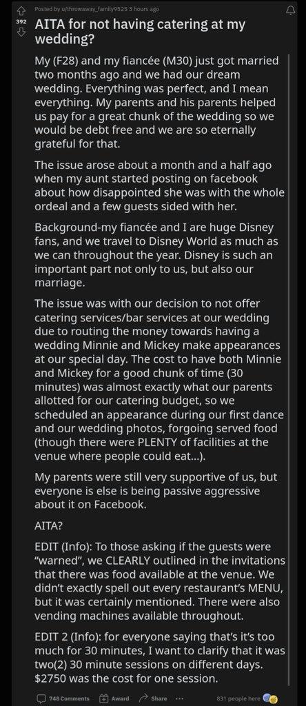 This Couple On Reddit S Aita Chose 6k Worth Of Mickey Mouse Appearances Over Feeding Their Wedding Guests Know Your Meme